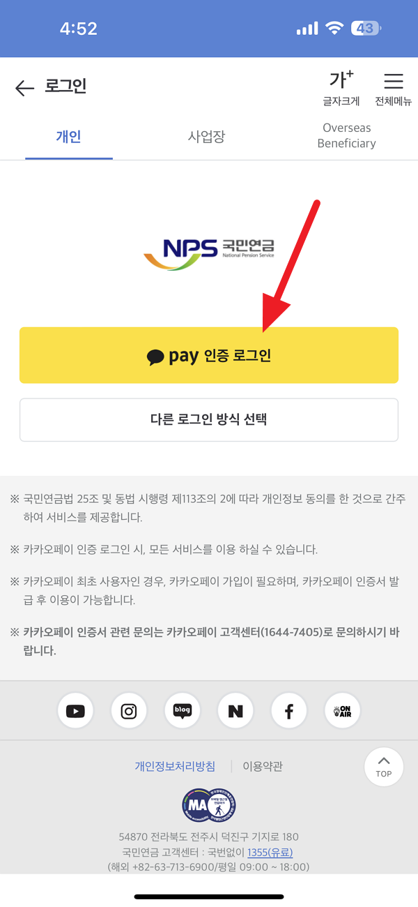 여러 가지 로그인 방식이 있지만 다른 방식 보다 페이 카카오 인증 로그인이 편해 저는 이 방식으로 로그인을 진행했습니다. 만약 원하시는 인증 방식이 따로 있으시다면 다른 로그인 방식 선택을 통해 로그인을 진행하시면 됩니다.