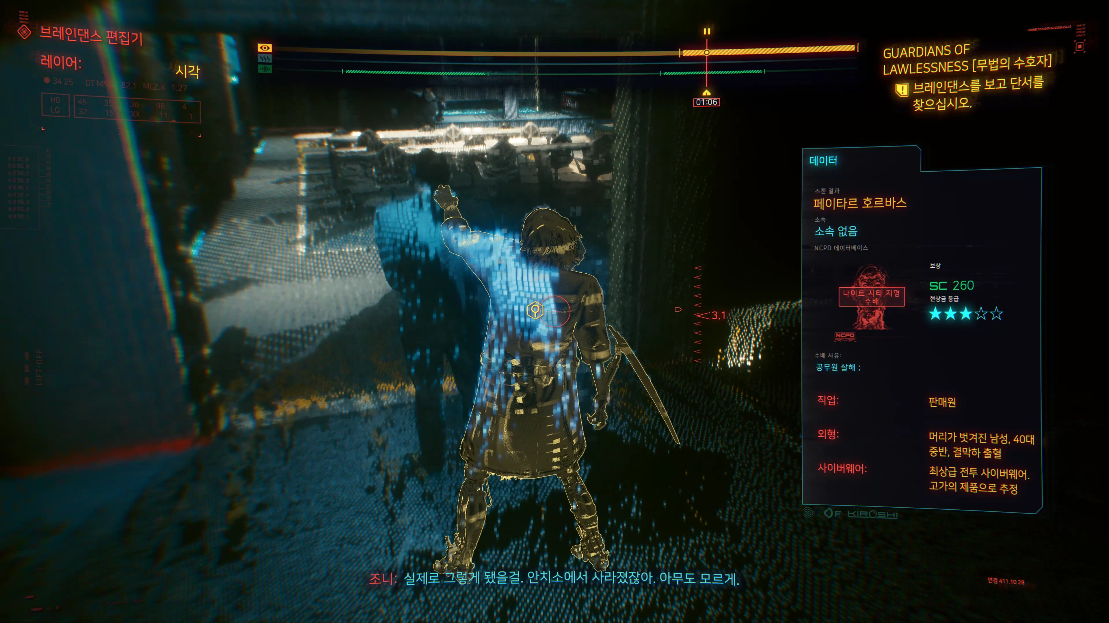 인간의 신체와 기계를 연결하는 사이버웨어 장착 방식은 신선하고 흥미로웠습니다. 업그레이드를 통해 2단 점프 같은 것들을 활용해 오픈 월드 건물을 자유롭게 뛰어넘으며 게임을 즐겼으며 인간의 신체를 개조한다는 느낌을 받아 좋았습니다.
