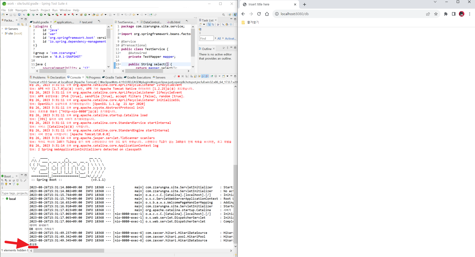 아래 이미지와 같이 로컬 호스트에서 db에 있는 데이터를 select 해 시스템 아웃을 찍어보니 데이터베이스에 있는 값을 잘 가져옵니다. 오른쪽 빈 웹페이지 화면은 잘되는지 테스트해 보기 위해 아무것도 없는 페이지에 컨트롤러에서 프린트로 값을 찍어본 결과입니다.