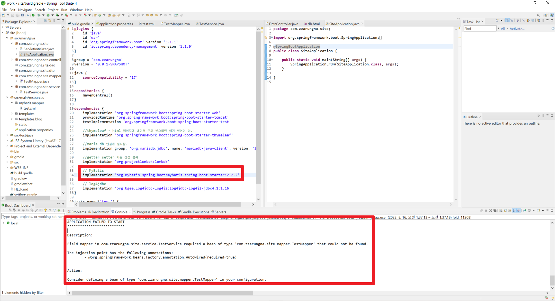 개인 취미 생활로 스프링부트 환경에서 사이트를 만들고 있습니다. mybatis를 연동해 데이터베이스에 있는 데이터를 가져오려고 했는데 아래 이미지와 같이 Field mapper in required a bean of type that could not be found. Consider defining a bean of type in your configuration. 라는 오류가 나며 구동이 제대로 안 되더군요. 이 오류 때문에 꽤 긴 시간을 허비했습니다. 문제는 새로운 스프링부트 버전 build.gradle 설정 MyBatis 버전을 3.0 이하 버전을 사용해 겪었던 문제였습니다.