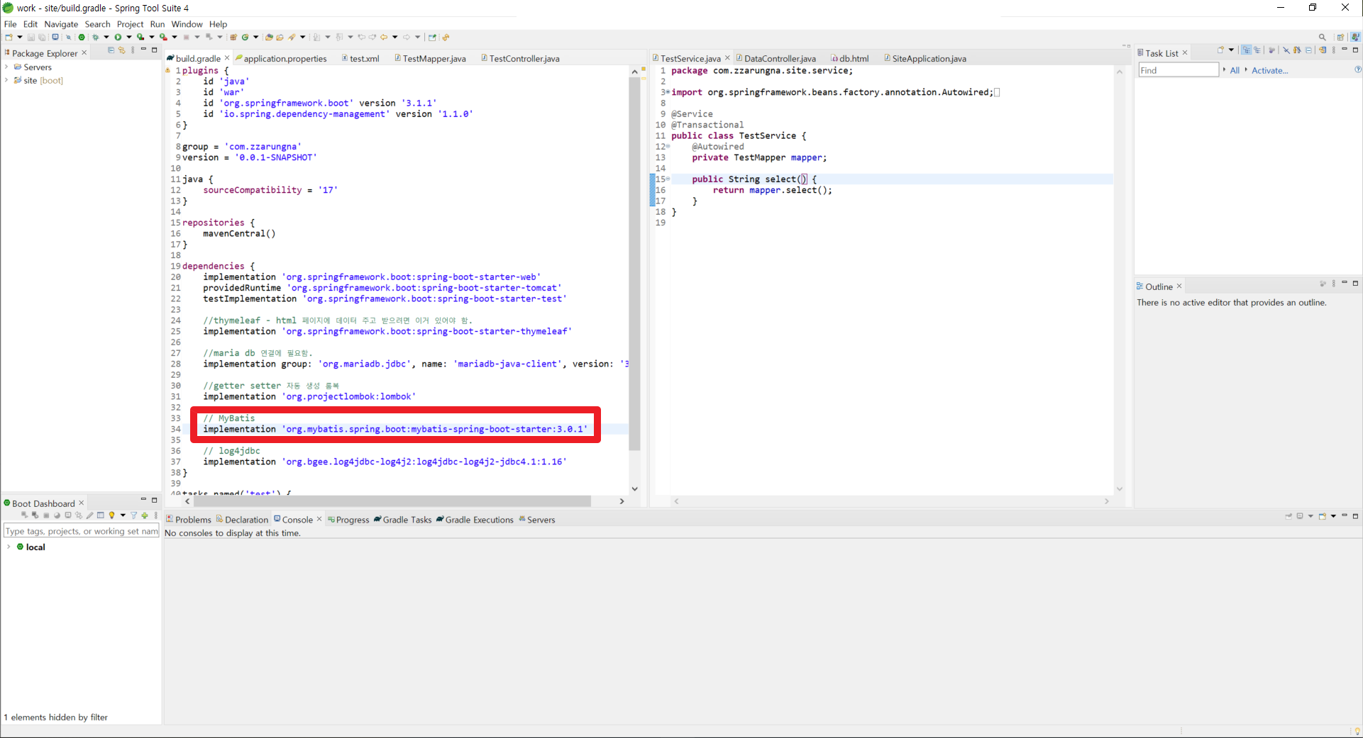 개인 취미 생활로 스프링부트 환경에서 사이트를 만들고 있습니다. mybatis를 연동해 데이터베이스에 있는 데이터를 가져오려고 했는데 아래 이미지와 같이 Field mapper in required a bean of type that could not be found. Consider defining a bean of type in your configuration. 라는 오류가 나며 구동이 제대로 안 되더군요. 이 오류 때문에 꽤 긴 시간을 허비했습니다. 문제는 새로운 스프링부트 버전 build.gradle 설정 MyBatis 버전을 3.0 이하 버전을 사용해 겪었던 문제였습니다.