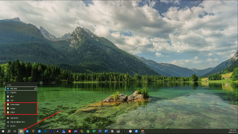 윈도우 작업표시줄에 폴더를 고정해 놓으셨다면 작업 표시줄 폴더를 마우스 오른쪽 버튼으로 선택하시면 즐겨 찾기에 놓으셨던 폴더 목록을 확인하실 수 있습니다. 아래 기능은 윈도우10 기준이며 윈도우11 버전에서는 표시되지 않더군요 참고하세요.