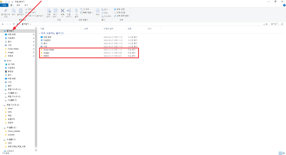즐겨찾기로 선택한 폴더 목록은 왼쪽 폴더 트리중 최상단에 위치에 있습니다. 그럼 방금 추가한 폴더가 즐겨 찾기에 저장되어 있습니다.
