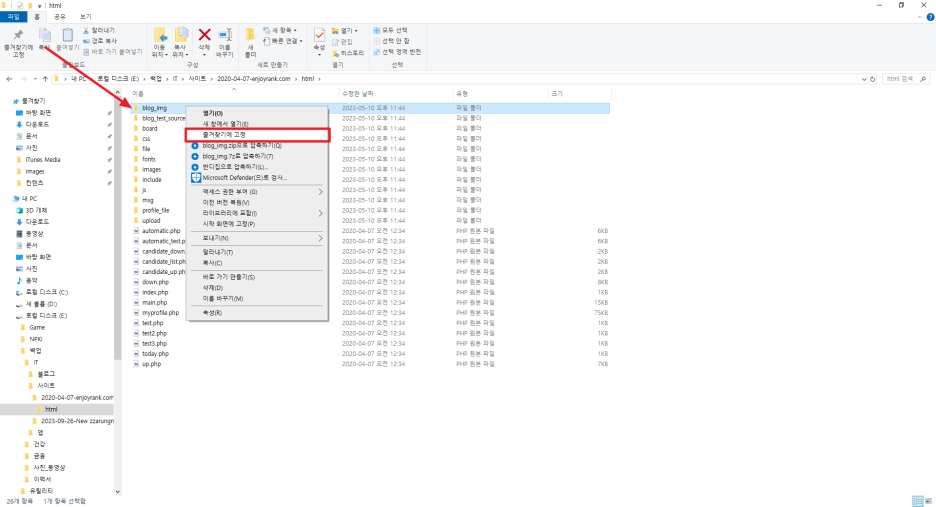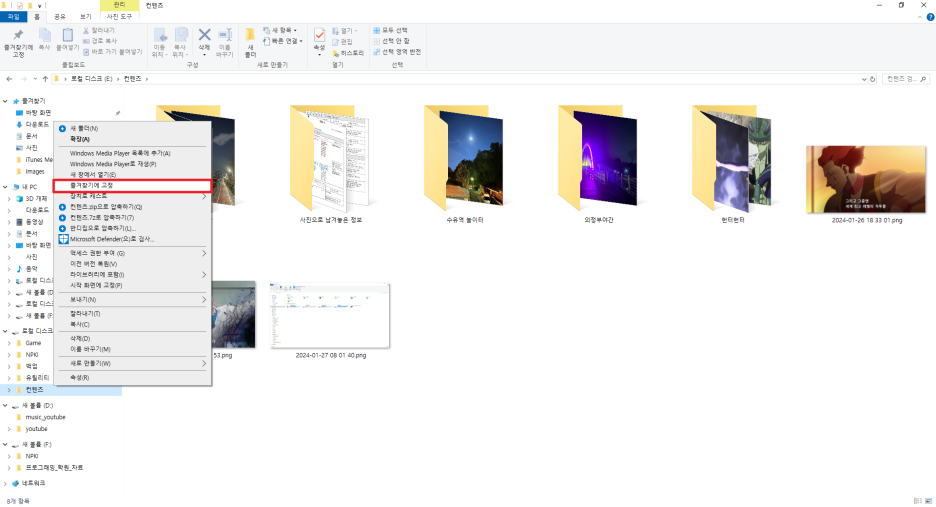 직접 폴더를 선택해 즐겨찾기 폴더에 지정하실 수도 있습니다. 원하는 폴더를 마우스 오른쪽 버튼으로 선택하시고 즐겨찾기에 고정 메뉴를 선택하시면 됩니다.