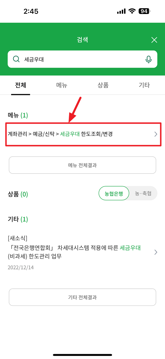 그리고 검색어로 세금우대 검색하시면 하단에 메뉴가 하나 검색됩니다. 계좌 관리 > 예금/신탁 > 세금 우대 한도 조회/변경 메뉴를 선택하시면 됩니다.