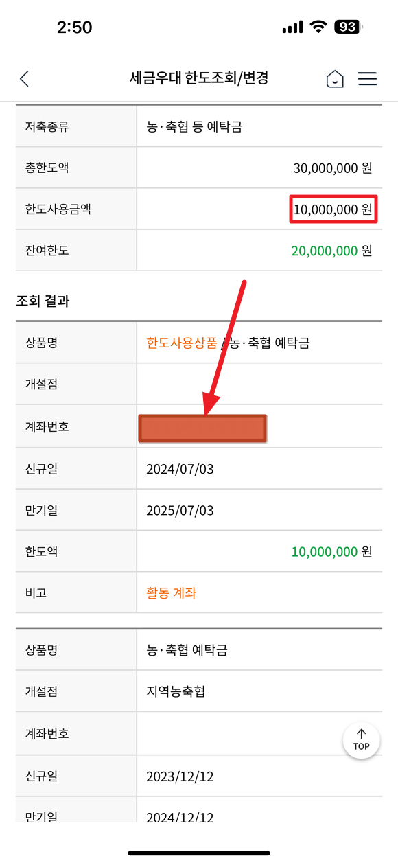 조회해 보니 가입했던 적금 계좌번호가 표시되며 세금 우대 한도와 잔여 한도가 표시됩니다. 조회 결과 항목에서 계좌번호가 표시된 부분을 선택해 주시면 세금 우대 한도를 변경하실 수 있습니다.