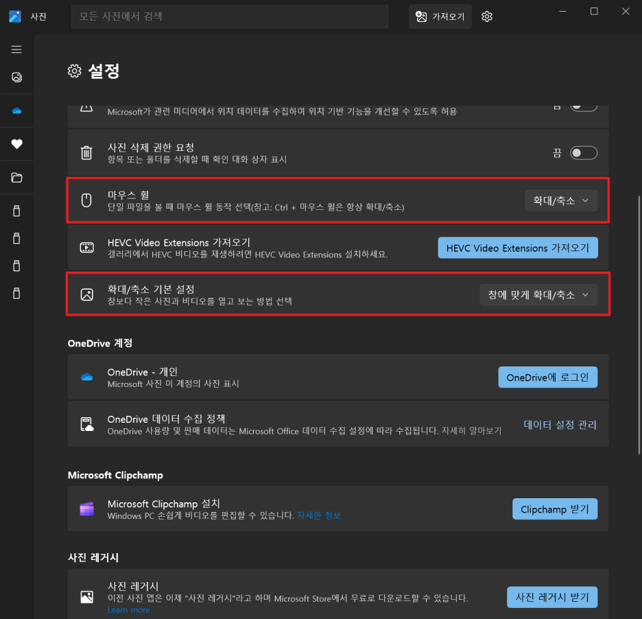 첫 번째 설정은 개인적으로 전 마우스 휠을 통해 이미지 파일을 확대하거나 축소 설정하는 편입니다. 여러 이미지를 키보드 방향키로 넘기다 보면 흐리거나 글자가 잘 안 보이거나 흐린 이미지를 편하게 확대하고 축소하려는 용도입니다.