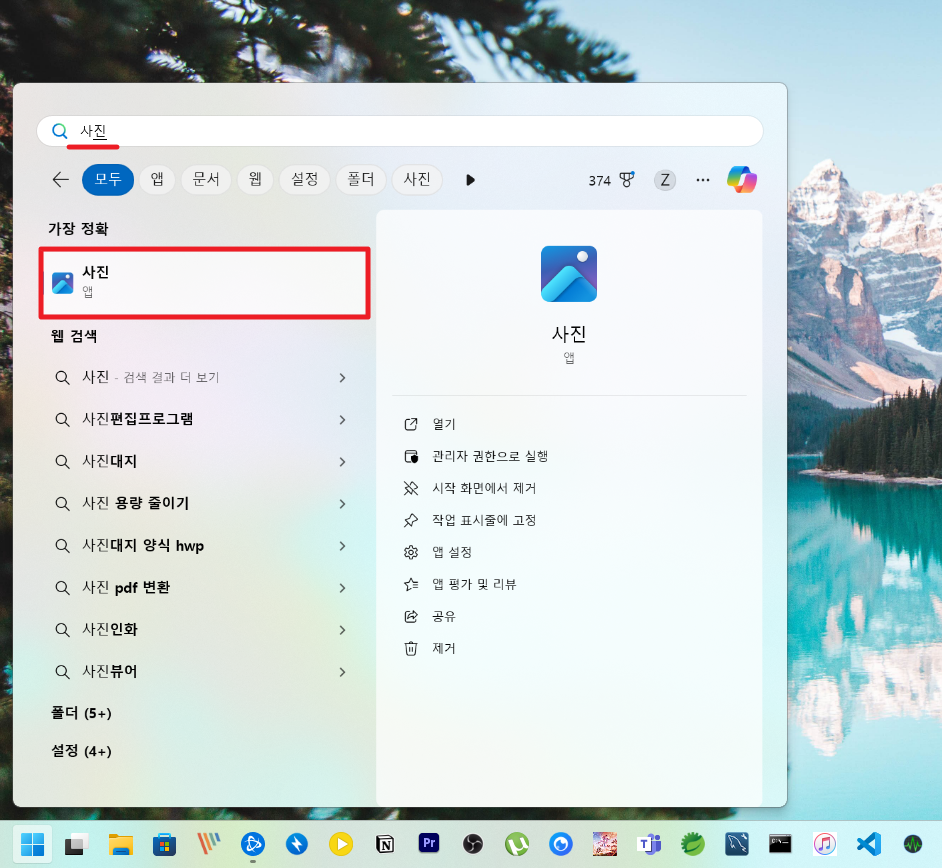사진 앱은 윈도우 10, 11 버전에서 윈도우키나 시작 버튼을 눌러 검색 부분에서 사진이라고 검색해 앱을 선택해 실행해 주시면 됩니다.