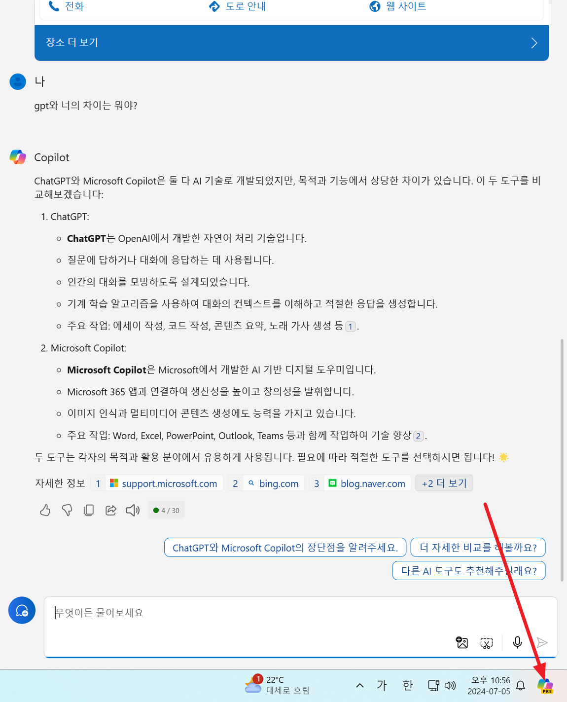 두 번째 장점은 AI 답변 기능 중 하나인 Copilot 기능이 윈도우11 운영체제에 내장되어 있어 간편하게 인공지능 답변을 받을 수 있다는 점입니다. 검색에서 찾기 어려운 내용을 인공지능 답변을 얻어 해결한 경험도 있지만 적절한 답변을 얻지 못한 경험도 있었습니다만 개인적으로 인터넷을 켜서 인공지능 답변을 얻는 것 보다 내장된 기능을 활용하니 훨씬 간편해 종종 사용하고는 합니다.