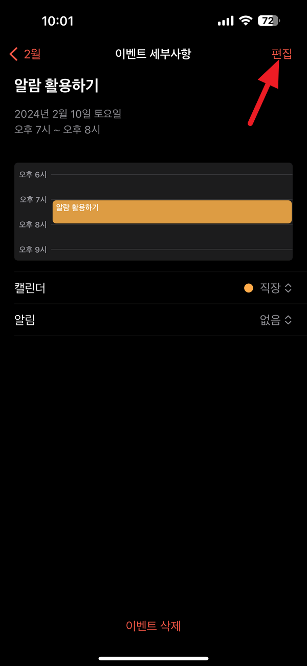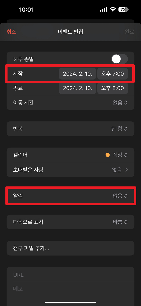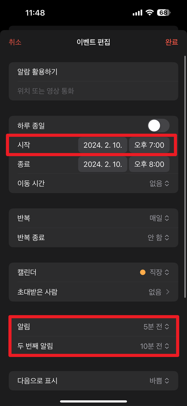 아이폰 달력 앱에 기존에 등록했던 일정이 있으셨다면 시작 시각과 알림 설정 메뉴가 설정되어 있는지 간단히 확인해 보실 수도 있습니다.
