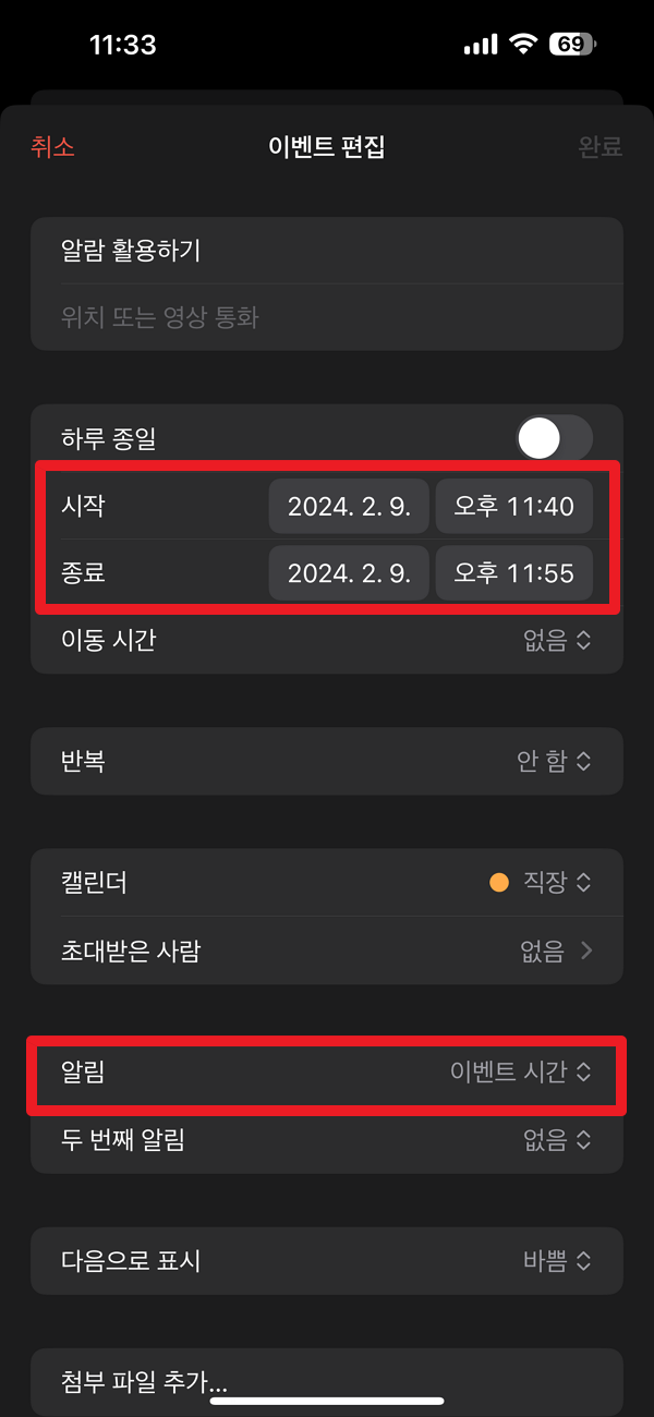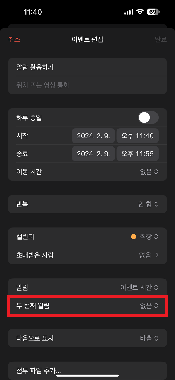 아이폰 달력 위젯 알람 기능을 활용하려면 이벤트 시작 시각이 가장 중요합니다. 시작 시각을 기준으로 알람을 설정할 수 있기 때문에 시작 시각이 곧 알람이 시작되는 시간이라고 생각하는 게 편하실 것 같습니다. 그리고 메뉴 중 알림 메뉴를 선택해 이벤트 시간으로 되어 있는지 확인하시면 됩니다. 2024년 2월9일 오후 11시 40분이 알람이 울리는 시간입니다.