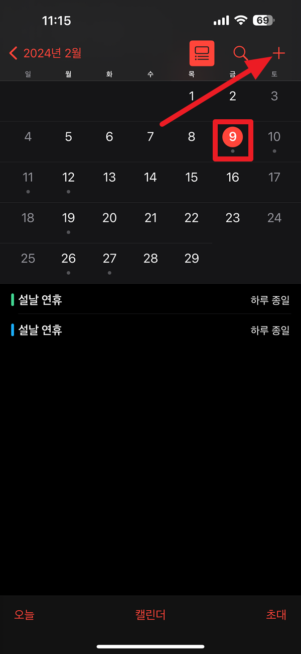 화면을 바꾸셨다면 + 기호 버튼을 눌러 아이폰 달력에 일정을 추가하실 수 있습니다.