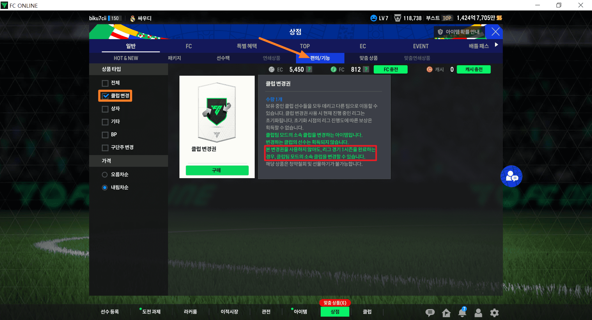 상점 메뉴에서 편의/기능 메뉴 선택, 상품타입 클럽변경 체크해 주시면 클럽 변경권 상품을 판매하고 있습니다. 이곳에서 클럽 변경권을 구매하셔서 바로 클럽팀 로고를 변경하실 수도 있지만 클럽 변경권 내용중 리그 경기 1시즌을 완료하시면 클럽팀을 변경하실 수 있다는 내용을 확인해 주시면 좋습니다.