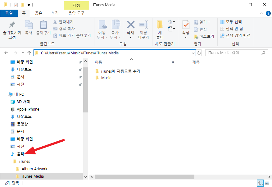 그런데 방금 아이폰으로 음악 파일을 이동하기 위한 MP3 파일들은 어디에 보관되어 있을까요? 윈도우10 기준으로 음악 폴더 안 iTunes 폴더 안 Music 폴더에 보관되어 있습니다.