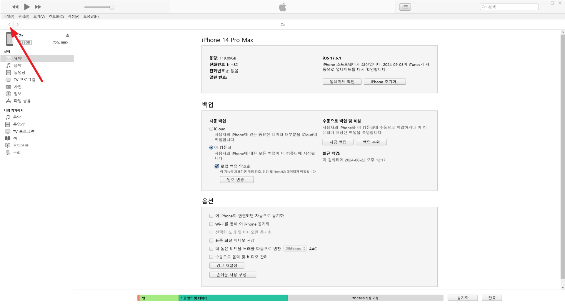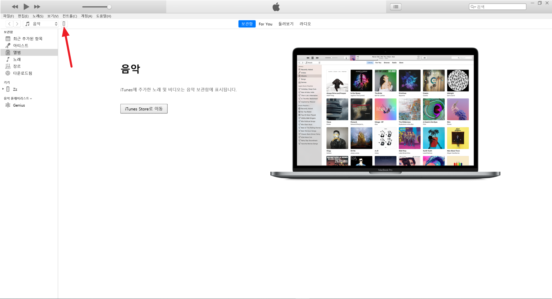 페이지를 뒤로 이동하시면 아이튠즈 보관함 항목 페이지로 이동되게 되는데 이곳에서 MP3 음악 파일을 드래그하시면 됩니다. 동기화할 음악 파일을 이동하게 되면 화면에 표시되야 하는데, 화면에 표시되지 않습니다. 버그인 것 같습니다. 애플 뮤직 매출 상승을 위해 일부러 일부러 고치지 않는 걸까요? MP3 노래 파일을 이동하셨다면 다시 핸드폰 모양의 아이콘을 눌러 주세요.