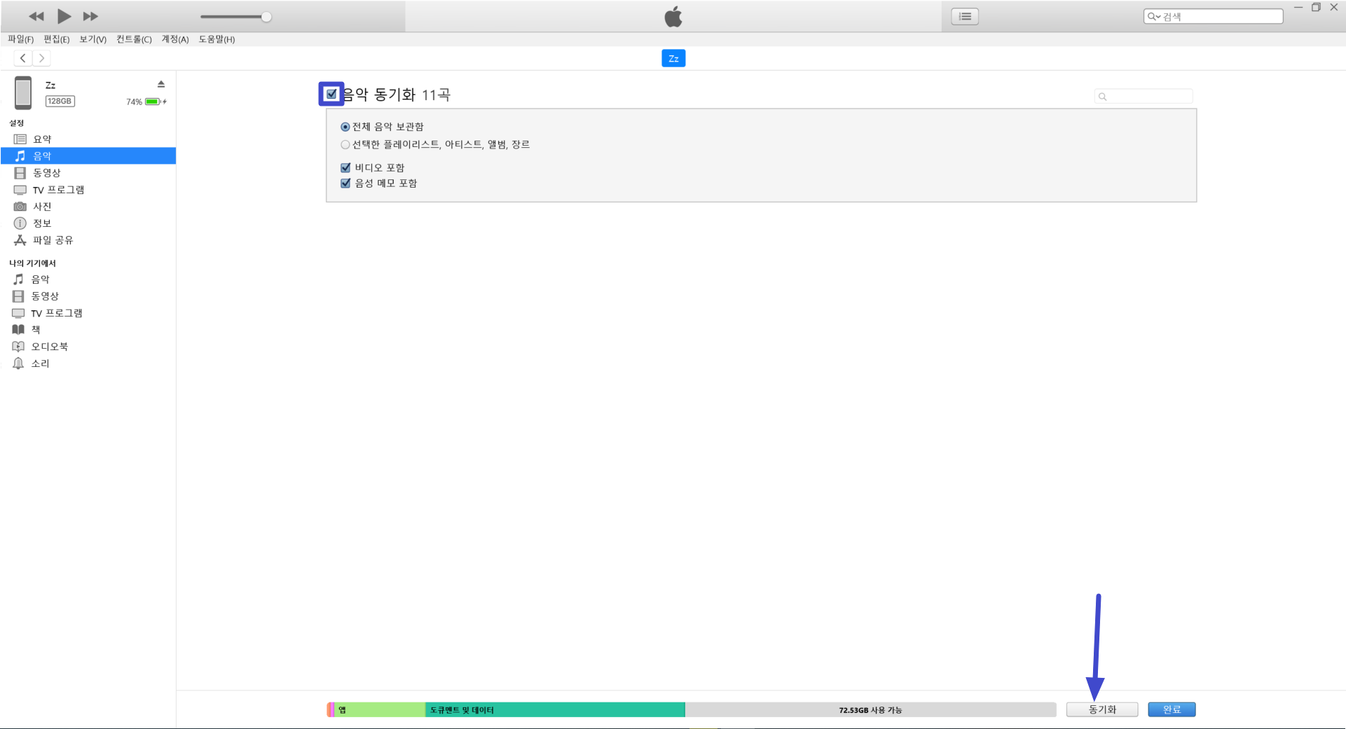 그럼, 아래 이미지와 같이 아이튠즈 프로그램에서 보관함에 파일을 드래그하는 방식을 사용하지 않고 폴더에 파일을 직접 이동해 동기화할 음악 파일을 추가했기에 아이튠즈 프로그램에선 동기화만 진행하면 됩니다.