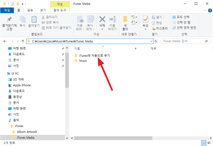 이번엔 Music 폴더가 아닌 iTunes에 자동으로 추가 폴더는 어떤 것일까요? 이 폴더는 아이튠즈 프로그램의 보관함을 거치지 않고 폴더에 직접 음악 파일을 넣어 수동으로 아이폰과 동기화할 노래 파일을 추가하는 방법입니다.
