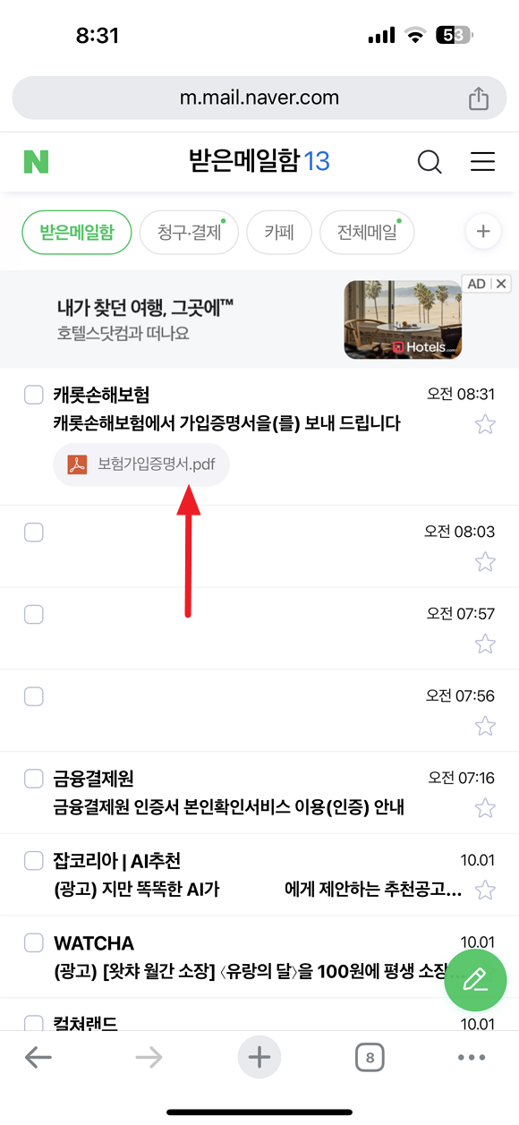 메일을 확인해 보니 캐롯손해보험에서 보낸 보험 가입증명서가 있습니다. 첨부된 파일은 비밀번호로 생년월일 여섯 자리가 필요했고 캐롯 보험회사의 자동차 보험 가입 증명서는 PDF 파일로 되어 있었습니다.