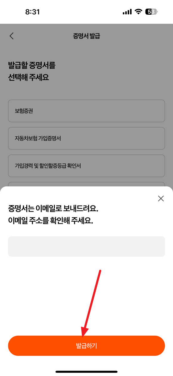 발급 증명서는 이메일로 보내준다고 되어 있었습니다. 제가 사용하는 이메일 주소를 하나 입력한 후 발급하기 버튼을 눌러 줬습니다.