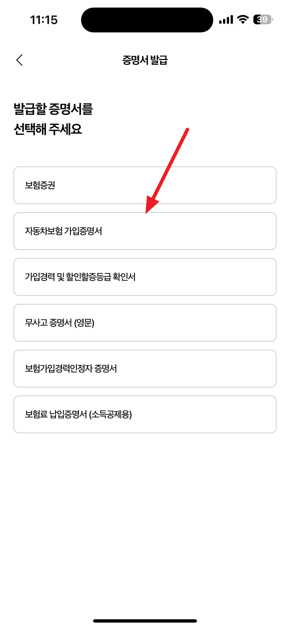 그럼 여러 가지 메뉴가 나오게 되는데 메뉴 중 가장 하단에 메뉴가 자리 잡고 있습니다. 아래로 계속 스와이프하다 보시면 증명서 발급 메뉴를 선택하실 수 있습니다.