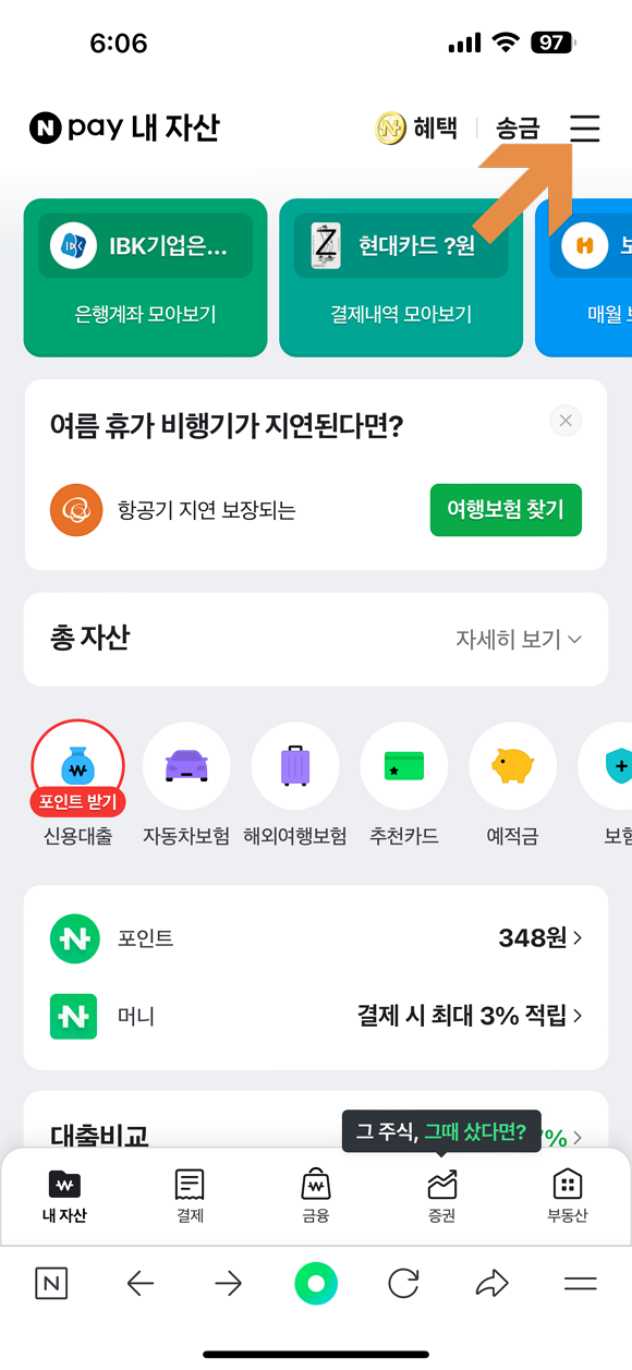 핸드폰 환경에 따라 화면 구성이 조금 다를 수 있지만 큰 차이는 없으실 겁니다. 작성 기준은 네이버 앱 아이폰 기준으로 작성하였습니다. 먼저 네이버페이 버튼을 선택해 주시면 됩니다.