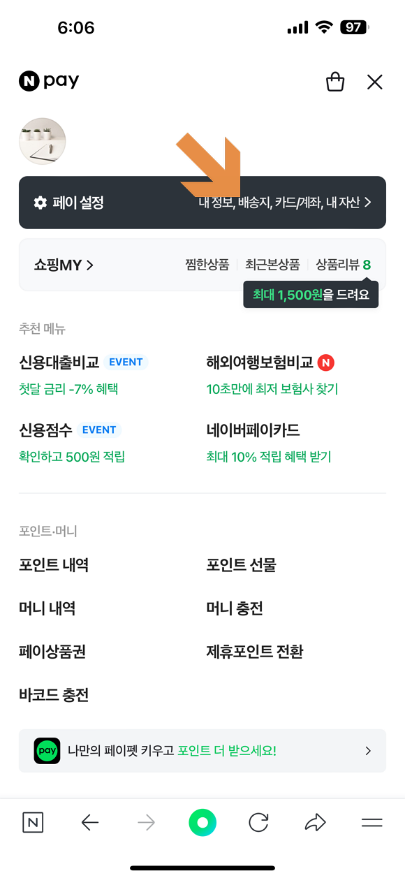 먼저 네이버 사이트에 로그인하시고 네이버 페이 링크를 선택하시면 됩니다.