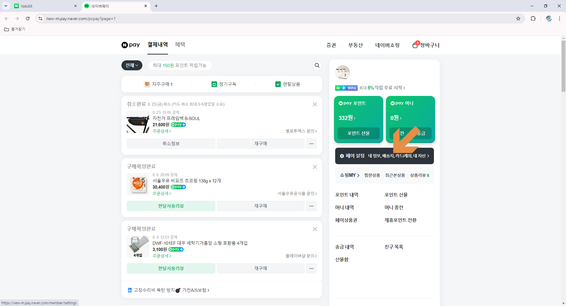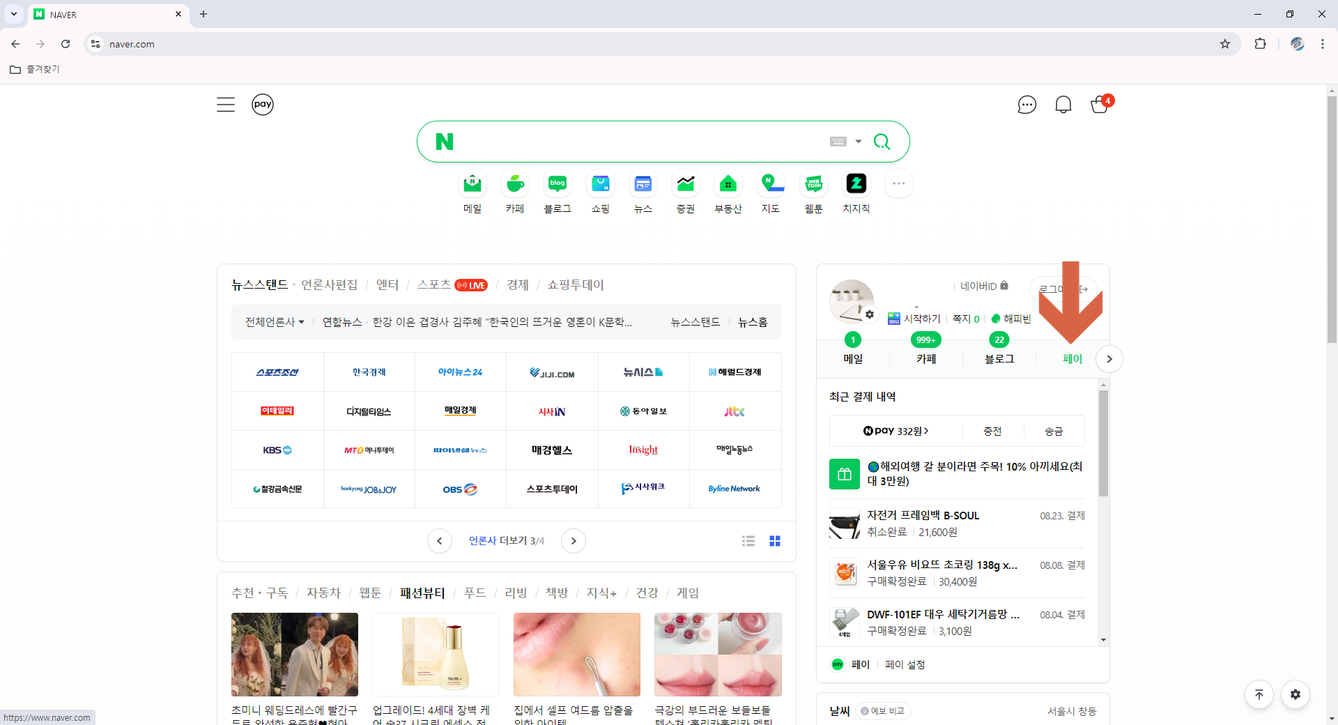 먼저 네이버 사이트에 로그인하시고 네이버 페이 링크를 선택하시면 됩니다.