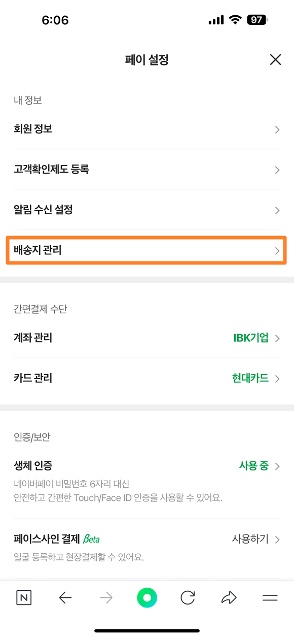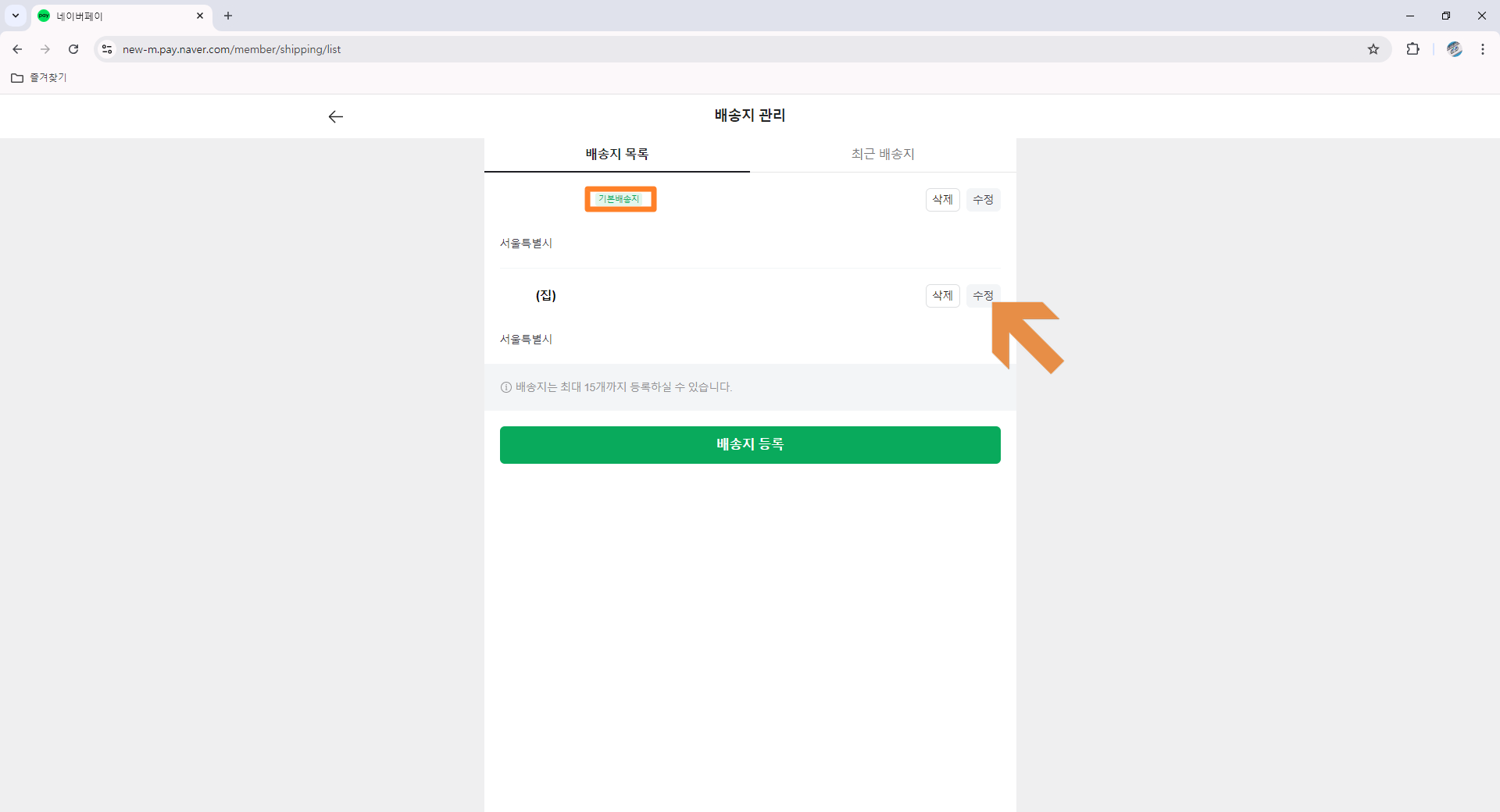 네이버 페이 화면을 보시면 배송지 글자가 있습니다. 배송지 글자 링크를 선택해 주시면 됩니다.