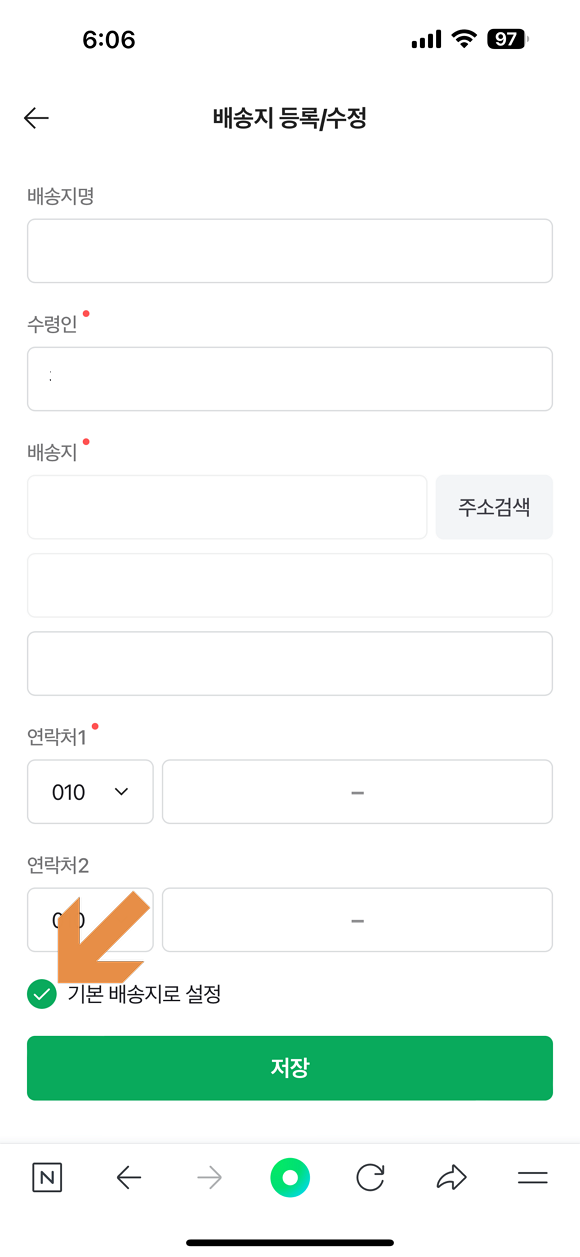 반드시 기본 배송지로 설정에 체크하셔야 기본 배송지가 변경되게 됩니다. 기본 배송지로 이미 설정된 주소엔 기본 배송지로 설정 체크 버튼이 표시되지 않으니 참고 하시면 좋을 것 같습니다.