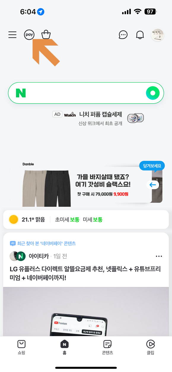 핸드폰 환경에 따라 화면 구성이 조금 다를 수 있지만 큰 차이는 없으실 겁니다. 작성 기준은 네이버 앱 아이폰 기준으로 작성하였습니다. 먼저 네이버페이 버튼을 선택해 주시면 됩니다.