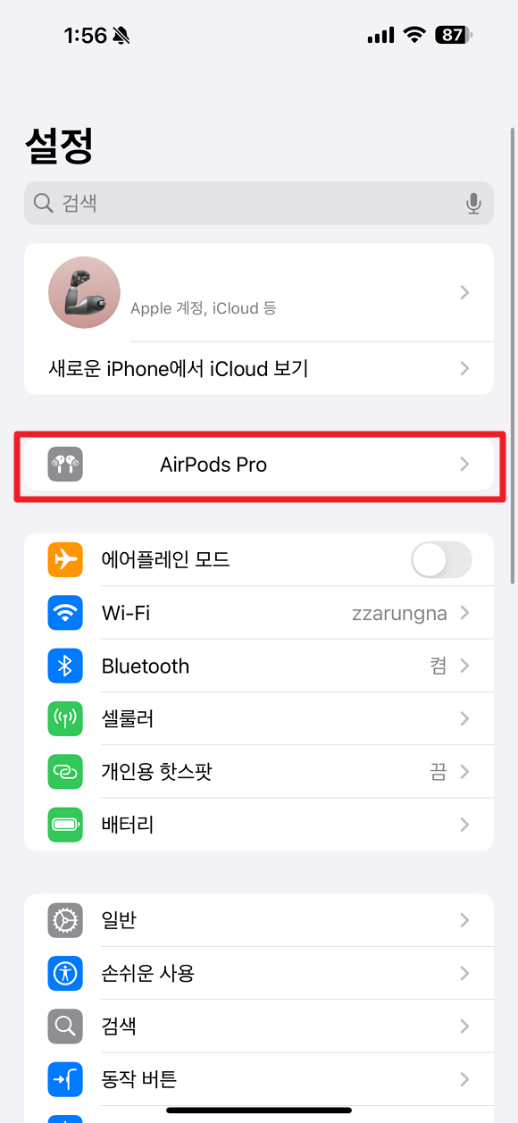 설정 메뉴에서 AirPods Pro 메뉴가 있습니다. 에어팟 프로가 활성화되어 있지 않은 상태라면 해당 메뉴는 표시되지 않기에 이 부분은 참고 하시면 좋을 것 같습니다.