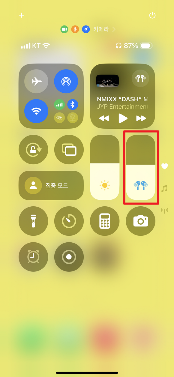 아이폰과 에어팟이 연결돼 있으며 에어팟 프로가 현재 활성화된 상태라면 아래 이미지와 같이 이어폰 모양의 아이콘을 터치하고 계시면 됩니다.