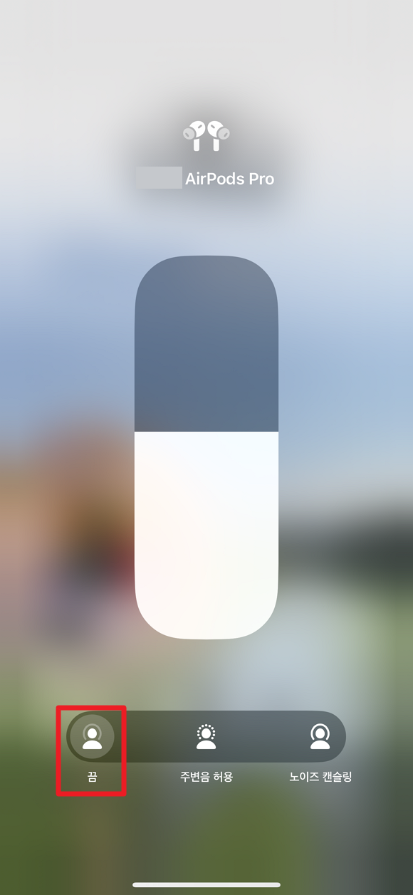 그럼, 총 3개의 메뉴가 표시되는데 주변음 허용과 노이즈 캔슬링이 설정된 상태라면 에어팟 프로의 이어폰의 위이잉 소리와 지지직 소리는 여전히 나오더군요. 그렇기에 끔을 선택해 에어팟 프로의 소음 제어의 모든 기능을 끄셔야 합니다.