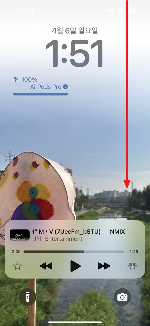 에어팟 프로 오른쪽 이어폰에서 나는 위이잉 소리와 지지직 소리는 의외로 간단히 없어졌습니다. 에어팟 프로의 기능을 아예 꺼버리니 에어팟 프로 이어폰에서 나던 잡소리도 없어지고 일반 이어폰처럼 계속 사용할 수 있게 되었습니다. 물론 에어팟 프로의 장점인 노이즈 캔슬링이 안 된다는 것은 큰 단점이기도 했지만, 외부 소리가 어느 정도는 들려야 되는 분들에겐 나쁘지 않을 것 같습니다. 먼저 아이폰 잠금 화면 상태에서 화면 상단 오른쪽 영역을 위에서 아래로 터치하시면 설정 메뉴가 표시되게 됩니다.